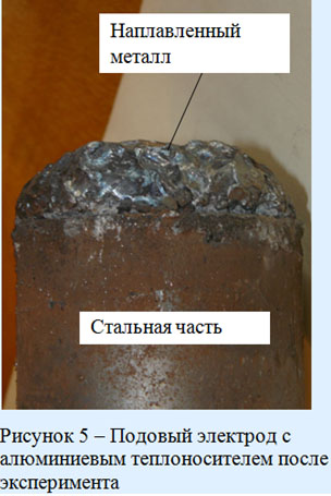 Таким образом, согласно расчетам и эксперименту, применение подовых электродов с промежуточным жидкометаллическим алюми-ниевым теплоносителем в ДСППТ позволит повысить эффективность теплопереноса от жидкой ванны к охлаждающей воде за счет электровихревого течения теплоносителя, что на практике будет способствовать минимизации образования анодных ям и повышению стойкости узла подового электрода.