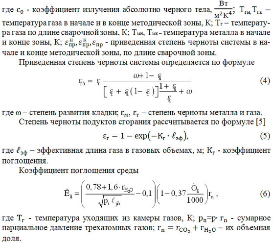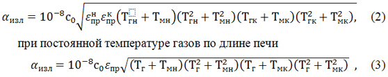 Исходя из геометрии методической и сварочной зон и температуры газов в этих зонах, определяются коэффициенты теплоотдачи излучением для верхних и нижних зон [6]. Коэффициенты теплоотдачи излучением при меняющейся температуре газов по длине печи вычисляются по формуле