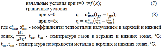 В методической и сварочной зонах нагрев заготовок осуществляется с двух сторон. Интенсивность нагрева сверху выше, чем снизу, т.е. нагрев является несимметричным. В томильной зоне металл, лежащий на монолитном поду, греется при постоянной температуре поверхности tпк, равной конечной температуре поверхности металла.
