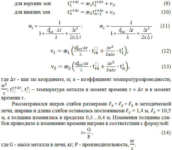 Дифференциальное уравнение (1) с начальными (7) и граничными (8) условиями решалось конечно-разностным методом с использованием метода прогонки [7]. Температура поверхности заготовки определяется из выражений: