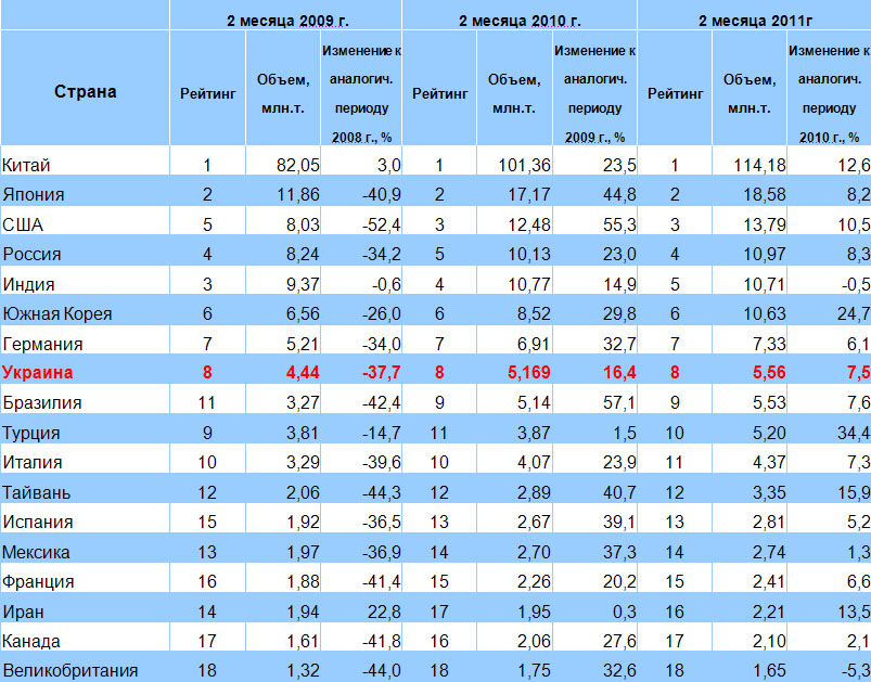 В феврале производство чугуна составило 2,206 млн. тонн (среднесуточное производство — 78,8 тыс. тонн; за четырнадцать суток марта — 81,7 тыс. тонн), стали — 2,669 млн. тонн (95,3 тыс. тонн; 100,8 тыс. тонн), проката — 2,493 млн. тонн (89 тыс. тонн; 91,3 тыс. тонн). В январе-феврале выплавка чугуна выросла по сравнению c аналогичным периодом прошлого года на 4% — до 4,617 млн. тонн, стали — на 9%, до 5,535 млн. тонн, проката — на 13%, до 5,271 млн. тонн. ...